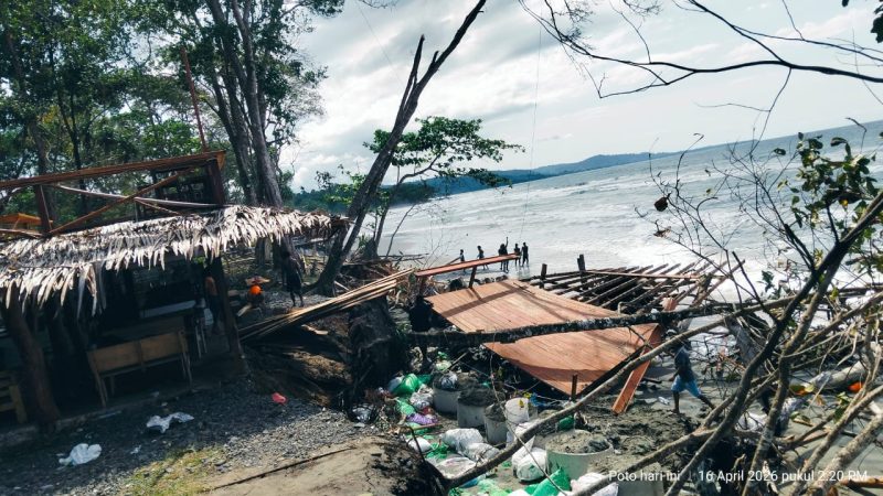 Garudapost.id |MANOKWARI – Abrasi pantai akibat gelombang tinggi yang melanda kawasan Tanjung Payung, Amban, Distrik Manokwari Barat, Papua Barat, selama sepekan terakhir mengakibatkan kerusakan parah pada kafe milik warga bernama Kevin. Usaha tersebut selama ini juga menjadi tempat penyedia makanan bagi masyarakat sekitar, Kamis (16/04/2026).