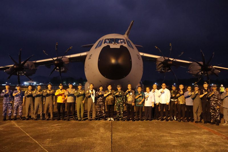 Selanjutnya, dilakukan prosesi pengalungan bunga kepada kru pesawat A-400 MRTT yang tiba di Manado, dilanjutkan dengan jajar kehormatan oleh personel yang telah disiapkan. Momentum tersebut kemudian diabadikan melalui sesi foto bersama antara para pejabat dan seluruh undangan forkompinda yang hadir.