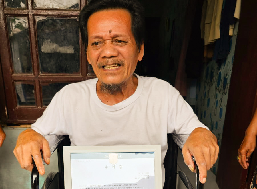 Ilham terlihat duduk di kursi roda barunya sambil memegang sertifikat bertuliskan huruf Korea dengan nama “Park Min Hoo”. Sertifikat tersebut diduga merupakan tanda apresiasi atau ucapan dari donatur asal Korea Selatan yang berkolaborasi dengan Yayasan Global Peduli.